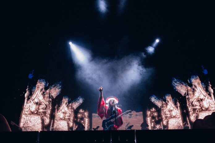 No decepciona la puesta en escena de Empire of the Sun. Si querías un montaje épico y over the top, el grupo australiano da dos tazas. El escenario, dominado por dos grandes esculturas de un rostro y una roca que parecen símbolos erosionados de tiempos remotos, poco a poco se sumerge en una estética mística y extravagante que incluye bailarinas con tocados de sol y luna, visuales que cabalgan entre el vaporwave y la ciencia ficción y portales proyectados desde la pantalla que parecen llevar a otra dimensión. En medio del escenario, dos huevos que representan el nuevo disco de Empire of the Sun, ‘Ask that God‘, se iluminan en diferentes colores.